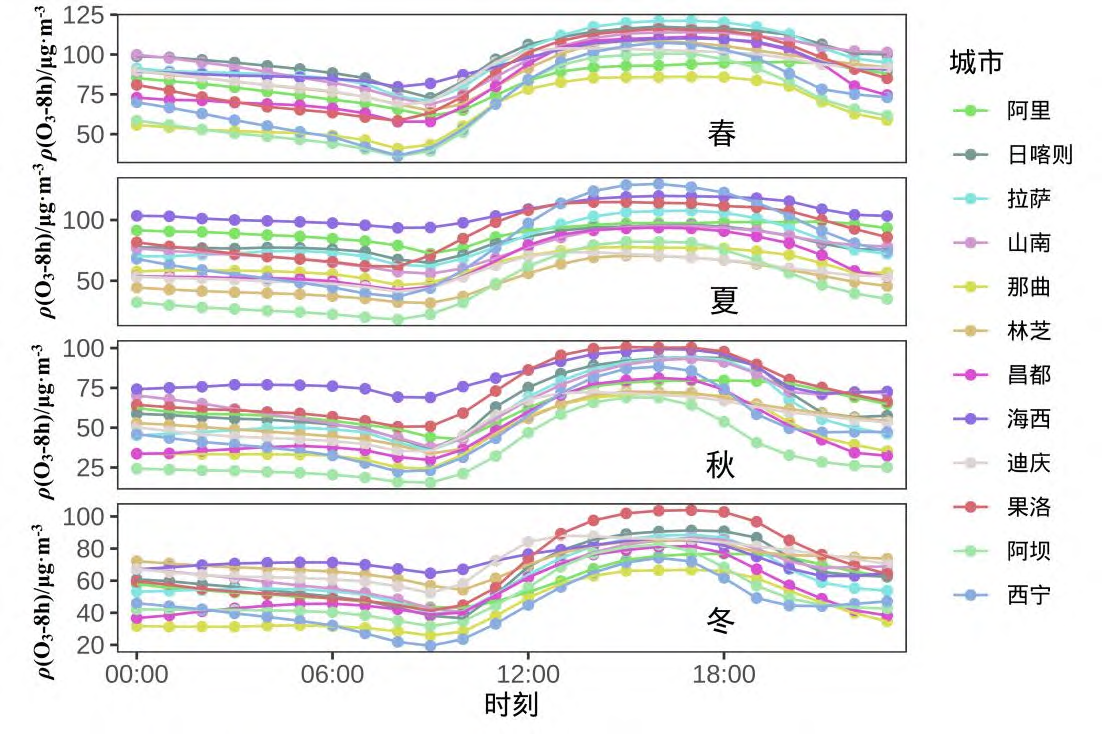 同时,青藏高原12个城市O₃浓度展现出明显的日变化特征,与我国其它区域报道的结果基本一致。且由于O₃作为光化学产物,与太阳辐射密切相关,也导致各城市O₃在四季均呈“日高夜低”的单峰特征。
