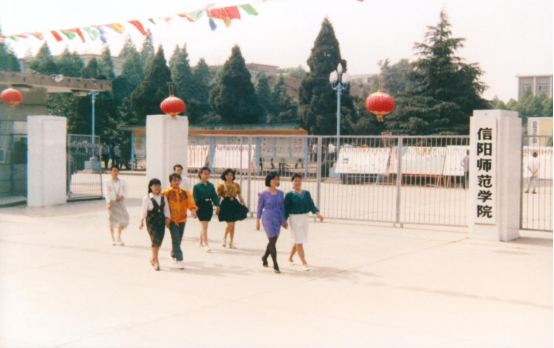 【校门】校园里每一处建筑不仅是师生心底的独特记忆,也成为学校历史发展的特殊见证。学校1975年7月正式创建,名称叫开封师范学院(今河南大学)信阳分院,校址设在信阳师范学校校内(民权街与合群路交叉口向东);1978年暑假,学校迁入长安路237号并在年底由“开封师范学院信阳地区分院”正式更名为“信阳师范学院”,学校的大门也在这四十余年中经历了多次的改造修建:从简单的平方铁大门到今天五层红瓦大楼;从开始的水泥路面到石子路,再到铺着沥青的新道路,经过三次改造;校名题字从黑体字到鲁迅笔体,字体颜色从黑到红再到今天的金色大字,越来越壮观美丽醒目和具有魅力。