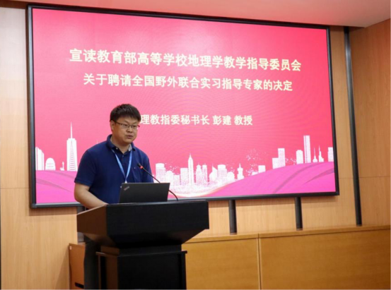 教育部高等学校地理学教学指导委员会秘书长、北京大学城市与环境学院副经理彭建教授宣读教育部高等学校地理学教学指导委员会关于聘请全国野外联合实习指导专家的决定。