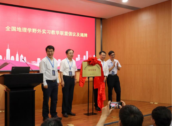 全国地理学联合野外实习教学联盟倡议及揭牌相继举行。华东师范大学党委副书记曹友谊教授、教育部高等学校地理学教学指导委员会副主任鹿化煜教授、参与单位代表陕西师范大学副董事长董治宝教授、理科基地发起单位代表福建师范大学曾从盛教授共同为联盟揭牌。