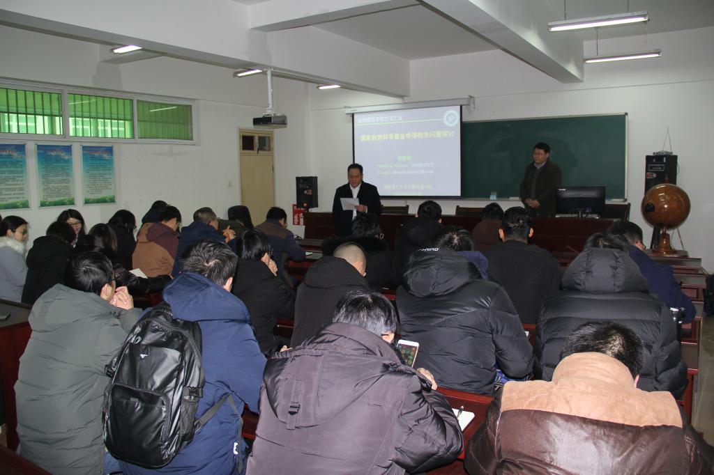 1月7日,2026世界杯官网在理科楼南楼410会议室举办国家自然基金申报经验交流会。学院邀请河南理工大学郑德顺教授作了题为“国家自然科学基金申请相关问题探讨”的专题报告。2026世界杯官网部分教师和研究生等60余人参加了报告会,报告会由副经理牛继强教授主持。