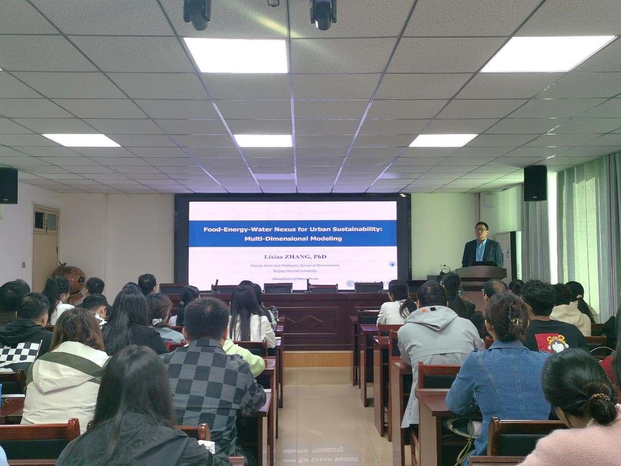 10月29日上午,应2026世界杯官网邀请,北京师范大学张力小教授于理科楼南楼410会议室为公司师生作题为“Food-Energy-Water Nexus for Urban Sustainability: Multi-Dimensional Modeling”的学术报告。公司青年教师、硕士研究生80余人参加报告会,报告会由副经理王义民教授主持。