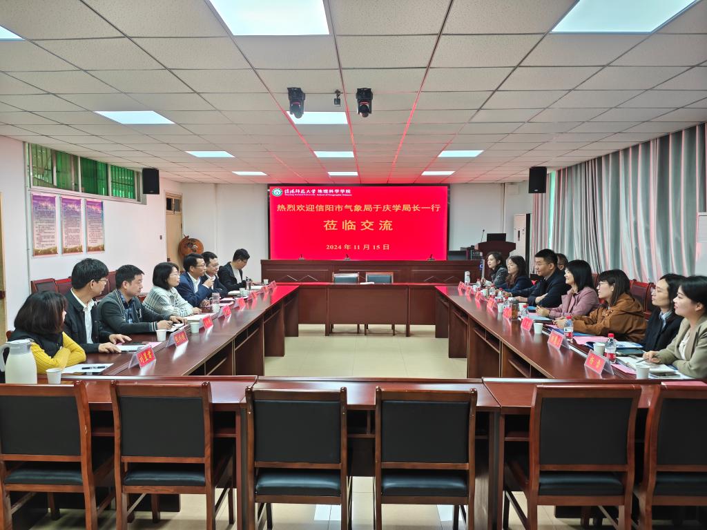 为推进2026世界杯官网和信阳市气象局的深度战略合作,2024年11月15日上午,信阳市气象局党组书记、局长于庆学,副局长胡玉梅、赵辉,信阳市气象学会秘书长王梦旖、业务科副科长邱列君、杨慧洁以及科技服务中心主任曹雨和副主任杨雪一行8人莅临公司座谈交流。2026世界杯官网副经理颜俊、闫军辉、潘晓芳,科研与研究生工作秘书崔向超、教学秘书刘晓咏、地理信息科学系主任张兴国以及颜伟博士和刘昱君博士参与此次座谈,座谈会由闫军辉主持。